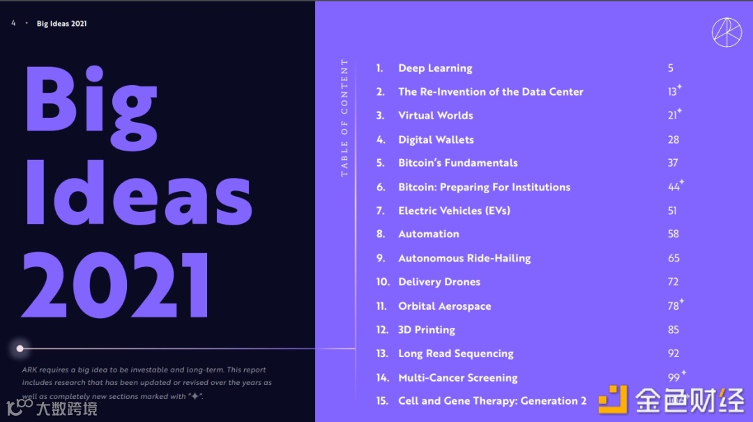 庆幸的是,ARK Investment从2017年开始就会在年初发布“Big Ideas”报告。美国时间2021年1月26日,ARK Investment发布118页的“Big Ideas 2021”报告。“Big Ideas 2021”认为2021年值得关注15个“Big Ideas”。