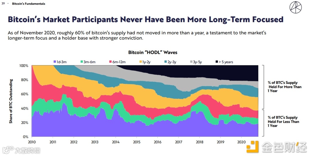 截至2020年11月,大约有60%的比特币供应量在一年多的时间里都没有动过,这证明比特币持有者对比特币更具有长期主义和更强信念。