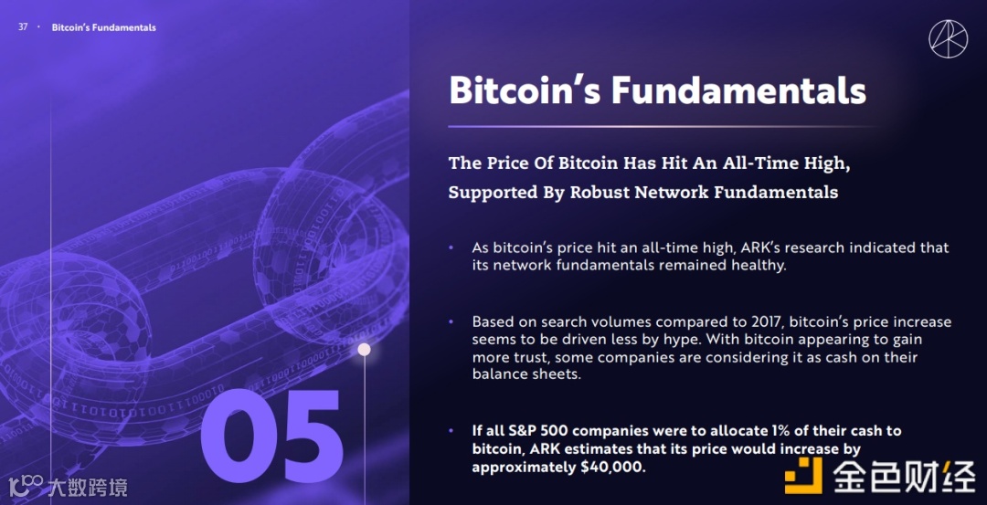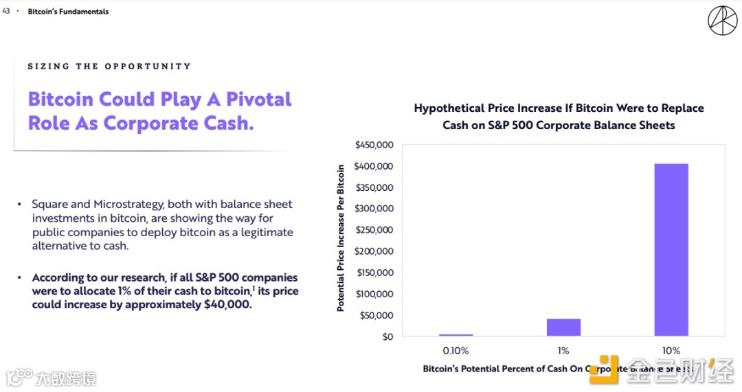 ARK分析发现,如果所有标准普尔500强公司都将1%的现金用于比特币,比特币价格将上涨约4万美元;机构投资者在2.5%至6.5%之间配置其资产,可能让比特币的价格升至20万美元到50万美元。