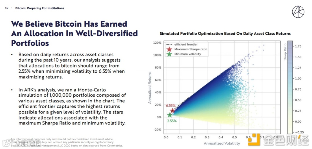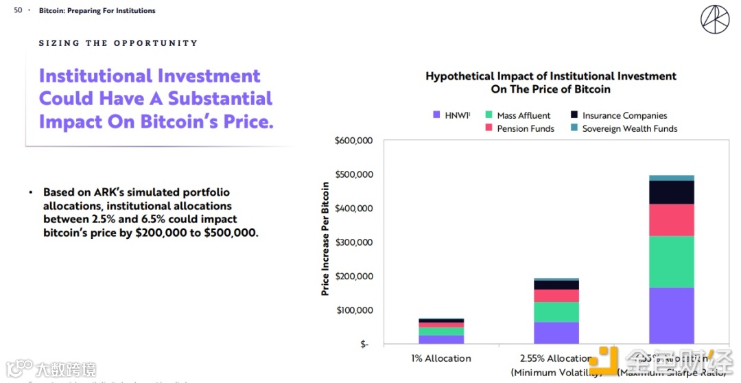 基于ARK对投资组合的模拟,机构投资者在2.5%至6.5%之间配置其资产,可能让比特币的价格升至20万美元到50万美元。