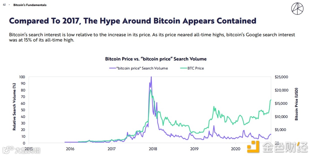 2、根据与2017年的搜索量相比,比特币的价格增长似乎不太受炒作的驱动。随着比特币似乎获得更多的信任,一些公司正考虑将比特币作为其资产负债表上的现金;