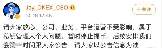理由二:由于OKex事件突然爆发,导致大量用户对中心化交易所出现信任危机从而引发挤兑,迅速恶化了平台备付水平……迫于无奈的情况下,只得暂停平台的充值提币业务。