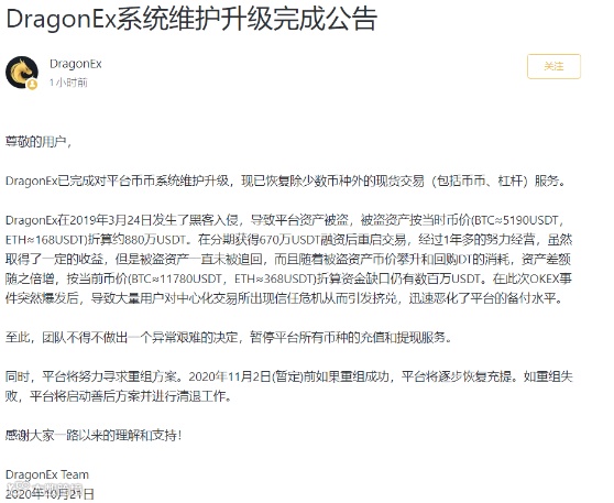 继OK事件之后,DragonEx龙网通告声明:升级维护,暂停提币!