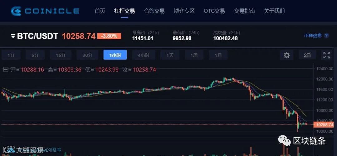 区块链达人Coinicle-BTC 1小时K线(14:55),报价10,258.74美元,日内跌幅3.80%。
