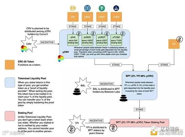 首先用户通过将DAI、USDT、USDC、TUSD等稳定币存入yearn.finance,协议将资产抵押以及收益通过yDAI、yUSDT、yUSDC、yTUSD返回给用户。