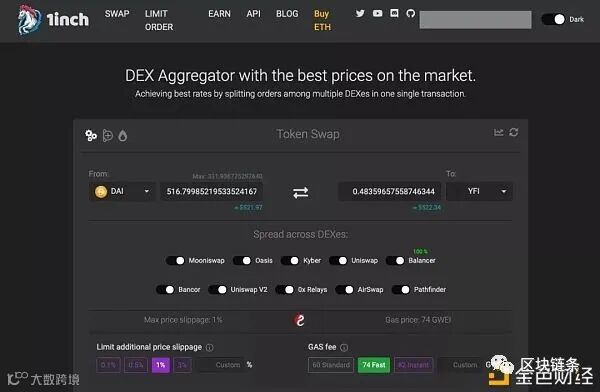 除了通过提供流动性来获取YFI之外,一种获得YFI的最简单方法是在去中心化交易所(DEX)1inch交易所上通过DAI或ETH来购买。