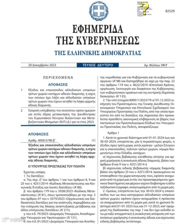 公告指出,凡持有有效护照或是其他旅行证件,根据第4251/2014号法律第8条第7款和第9条第4款之相关规定,已首次提交居留申请或是更新居留许可所需的所有证明文件,或根据第4251/2014号法律第25条之相关规定,持有合法居留特殊证明的所有第三国公民,在2024年1月1日至3月30日期间都可以多次离开和返回希腊。