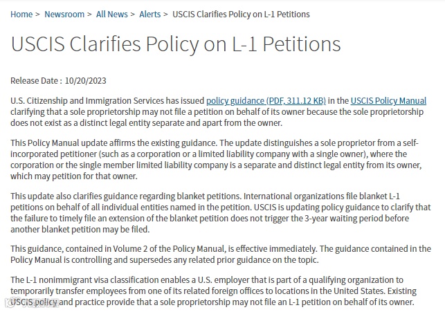 2023年10月20日,美国移民局发布了关于L-1签证的最新政策指南,澄清(Sole Proprietorship)(独资企业)不可以为其所有人提交 L-1 申请,因为独资企业在法律上与其个人是一体的,并不是独立的实体。