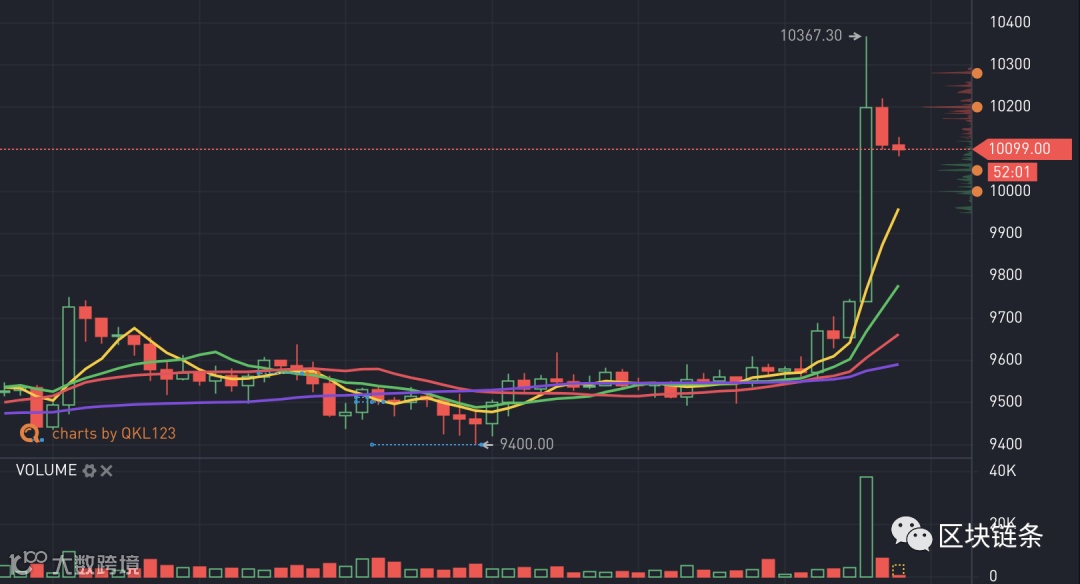QKL123行情显示,在9500美元上下纠缠了4天之后,今日早间,比特币终于迎来突破,1个小时之内上冲超过6%,达到10367.3美元,创下近3个月新高。虽然有所回落,当前比特币价格依旧在10100美元附近,涨幅超过6%,呈现领涨态势。