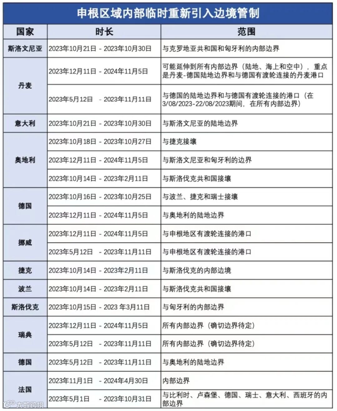 目前,申根区内共有11个国家恢复边境检查:意大利、奥地利、德国、法国、捷克、波兰、斯洛伐克、瑞典、丹麦、斯洛文尼亚、挪威。