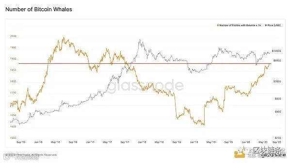 根据Glassnode于6月15日发布的“每周链上报告”显示,自2020年1月以来,持有1000 BTC或更多的交易者的比特币鲸鱼数量一直稳定增长。 目前持有至少1000BTC有1882条鲸鱼。