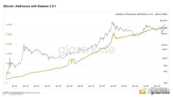 来自Glassnode的数据显示,持有超过0.1BTC的 BTC 钱包地址的数量达到了历史新高。