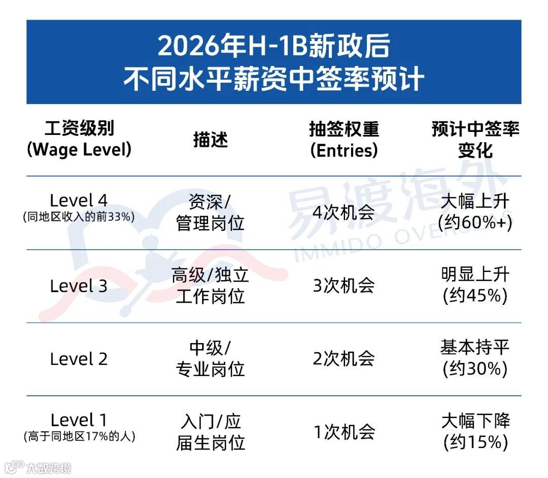 对于大多数刚毕业、工作年限较短的留学生来说,所对应的岗位通常是 Level 1 或 Level 2 工资等级。在加权机制下,这部分人群的中签概率,将明显低于过去。