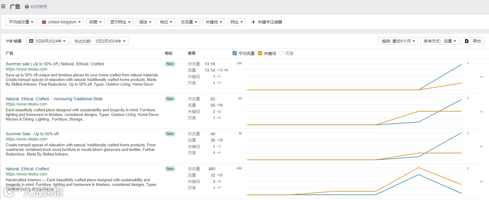 Nkuku布局与品牌本身或品牌相关的具体位置和产品的关键词,不仅有助于提升品牌的在线可见性,也能吸引对品牌感兴趣的用户,从而守住自己的品牌流量池。而其布局的行业关键词,涉及到具体的家居装饰类别,这则有助于吸引对特定家居装饰产品感兴趣的潜在消费者。