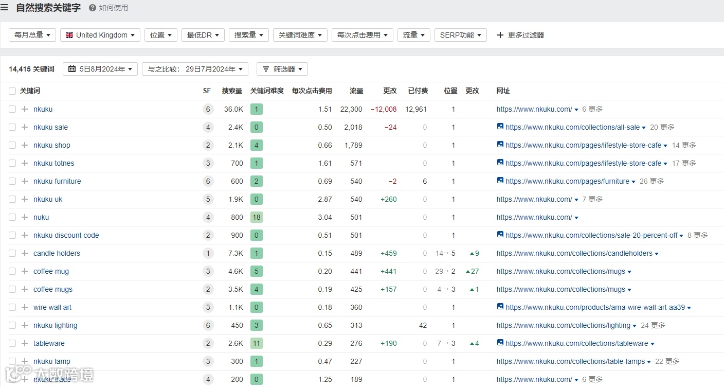 根据ahrefs数据显示,为Nkuku官网带来较多流量的关键词,基本上集中在品牌词和行业关键词上,这些关键词难度普遍较低,所以Nkuku官网在这些关键词下,都有较为靠前的排名。