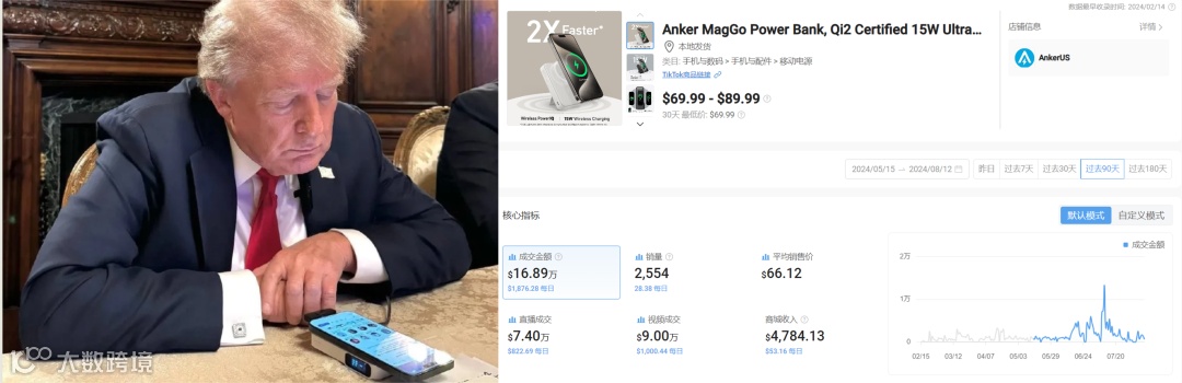 8月13日,当特朗普与马斯克在直播中对话时,意外地让一款中国品牌的充电宝——Anker,成为全球焦点。直播中,特朗普桌上的Anker充电宝无意间出镜,迅速引发市场的热烈反响。这款在国内售价399元人民币的充电宝,在美国TikTok上售价为$69.99 - $89.99(约合人民币502-646元),彰显了中国品牌产品在国际市场上的溢价能力。