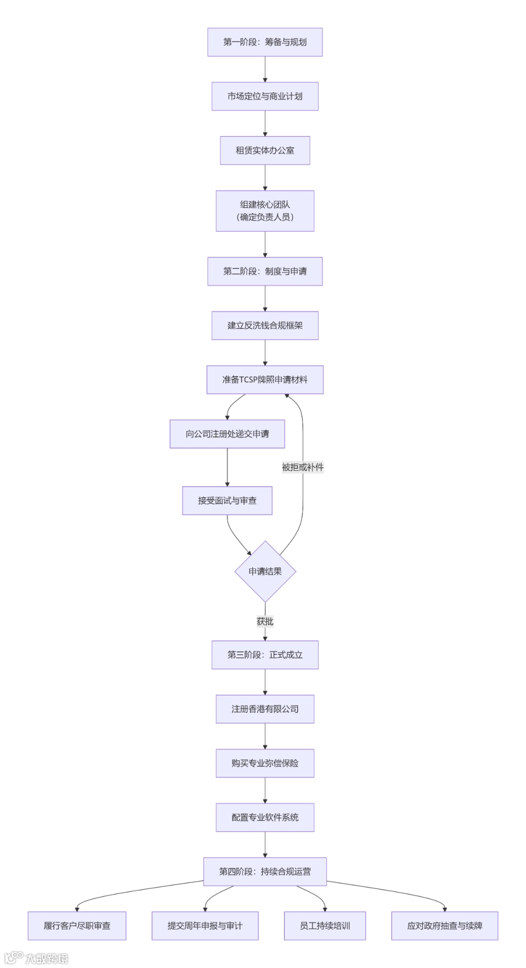 获取TCSP牌照,这是成立合法秘书公司不可逾越的红线。根据香港法例,任何提供以下服务的机构都必须向公司注册处申领TCSP牌照。流程概括如下:
