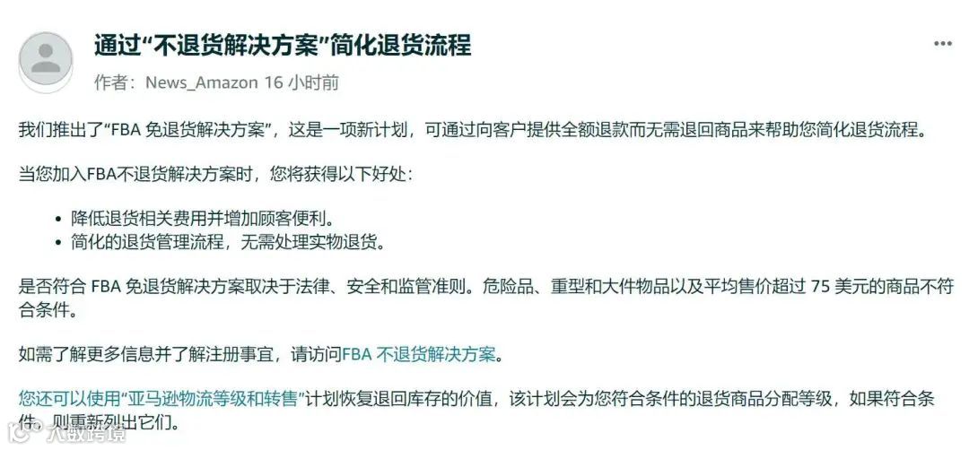 亚马逊美国站发布最新公告,宣布推出了一项名为“FBA 免退货解决方案”的新计划,即卖家可通过向客户提供全额退款且无需退回商品来简化退货流程。