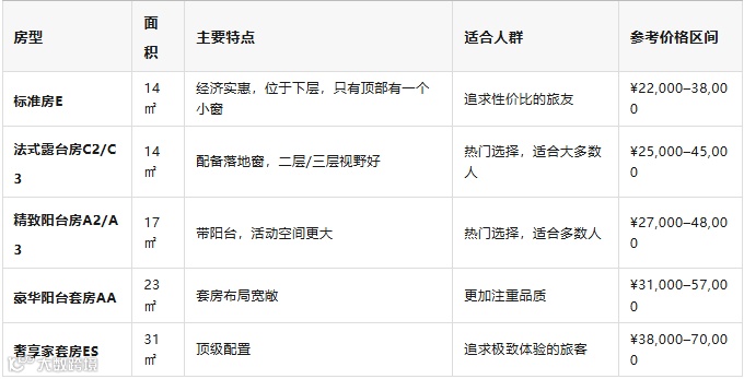 不同舱房各有特色,适配不同需求与预算,其中法式露台房与精致阳台房性价比最高(两者核心差异在于是否带阳台,景观体验不受影响)。结合官方信息,各房型详细信息如下: