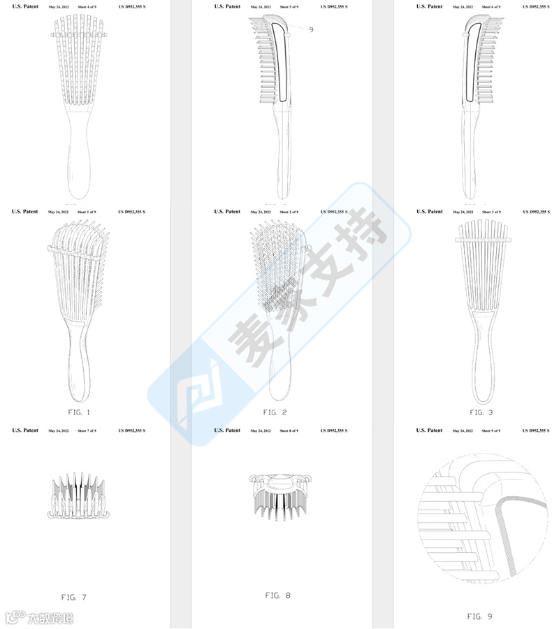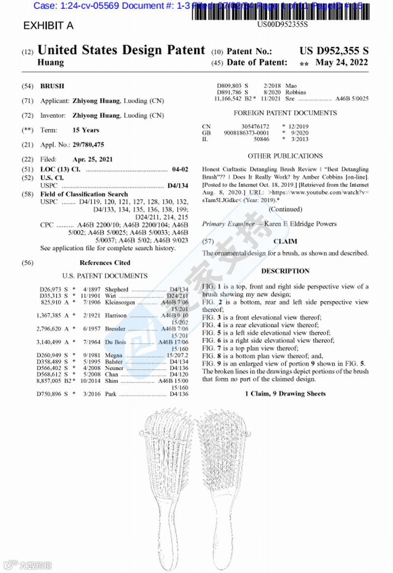 通过以上专利可发现,该梳子于2021年4月25日成功申请并于2022年05月24日获得美国专利认证(专利号D952355)。然而,有趣的是,面对突如其来的TRO冻结,多位卖家能够有力举证,该产品早在数年前便已活跃于市场,其原创性并非新近之事。