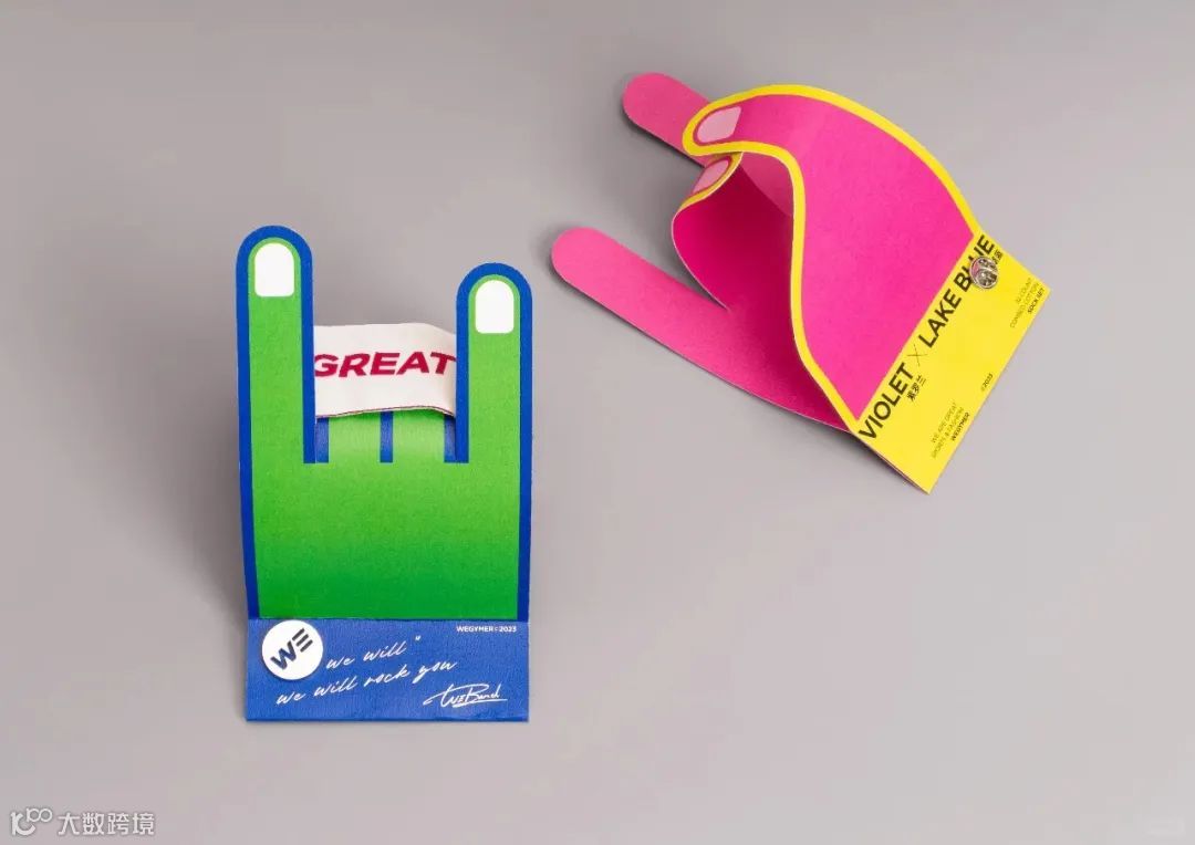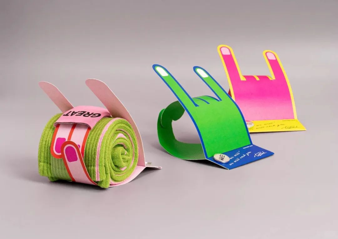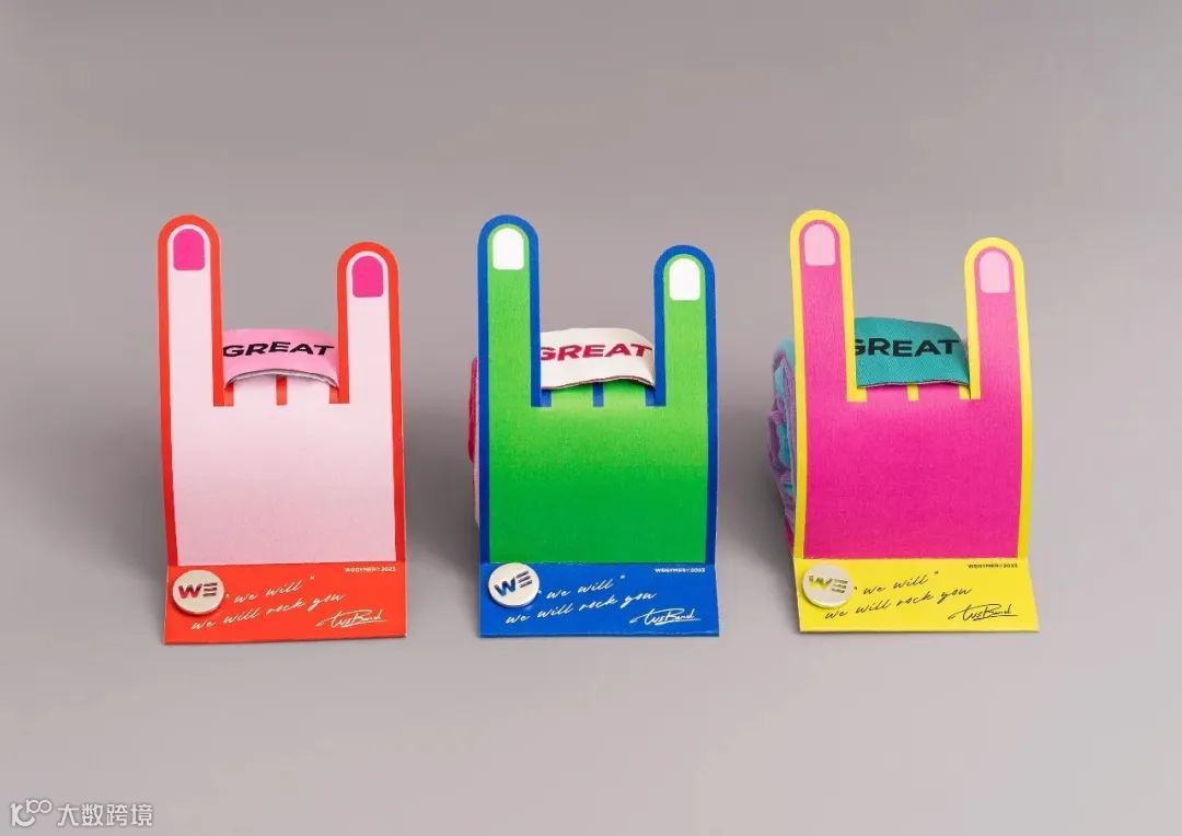WE-ROCK袜子的包装设计灵感源于皇后乐队的经典歌曲“We Will Rock You”,巧妙地将“Rock”手势融入结构设计中。