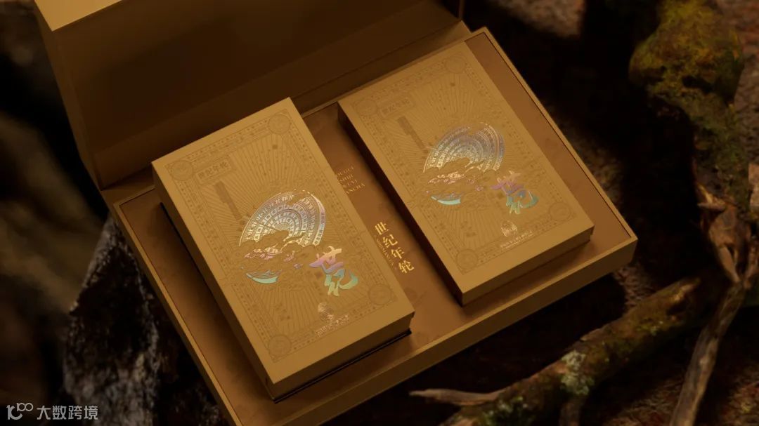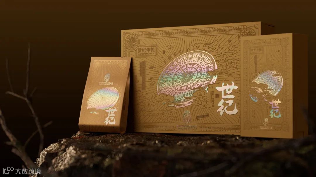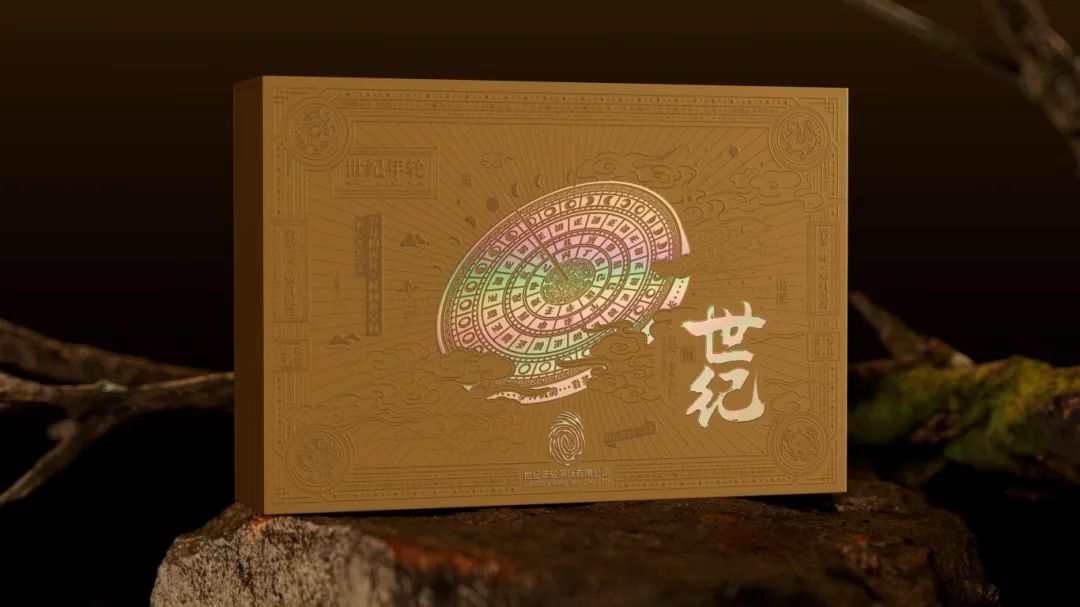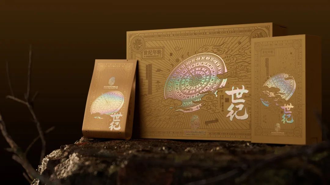 世纪年轮武夷岩茶包装以“日晷”为核心视觉符号,结合凹凸工艺与镭射技术,强化时间流转的立体感。