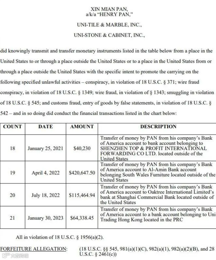 此外,起诉书还指出,被告利用空壳公司,在进口文件中虚假登记美国境内的进口商与收货人,而货物的实际最终去向,仍是潘信勉所拥有的友利瓷砖云石与友利石材橱柜公司。同时,被告还被指控对商品进行不实分类,并向海关提交虚假文件。