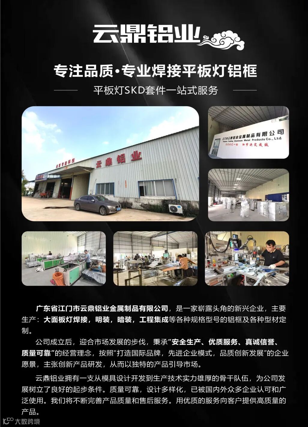 江门市云鼎铝业金属制品有限公司是一家集研发、生产、销售于一体的高新技术企业,专注于平板灯铝框焊接制造领域,致力于为客户提供平板灯SKD套件的一站式解决方案。公司拥有现代化标准厂房8000平方米,配备先进的全自动焊接生产线和精密检测设备,年产能达500万套。自成立以来,公司始终秉持"诚信为本、责任为先、追求卓越、持续创新"的经营理念,组建了一支由20余名专业工程师组成的技术团队,已获得ISO9001质量管理体系认证和多项实用新型专利。