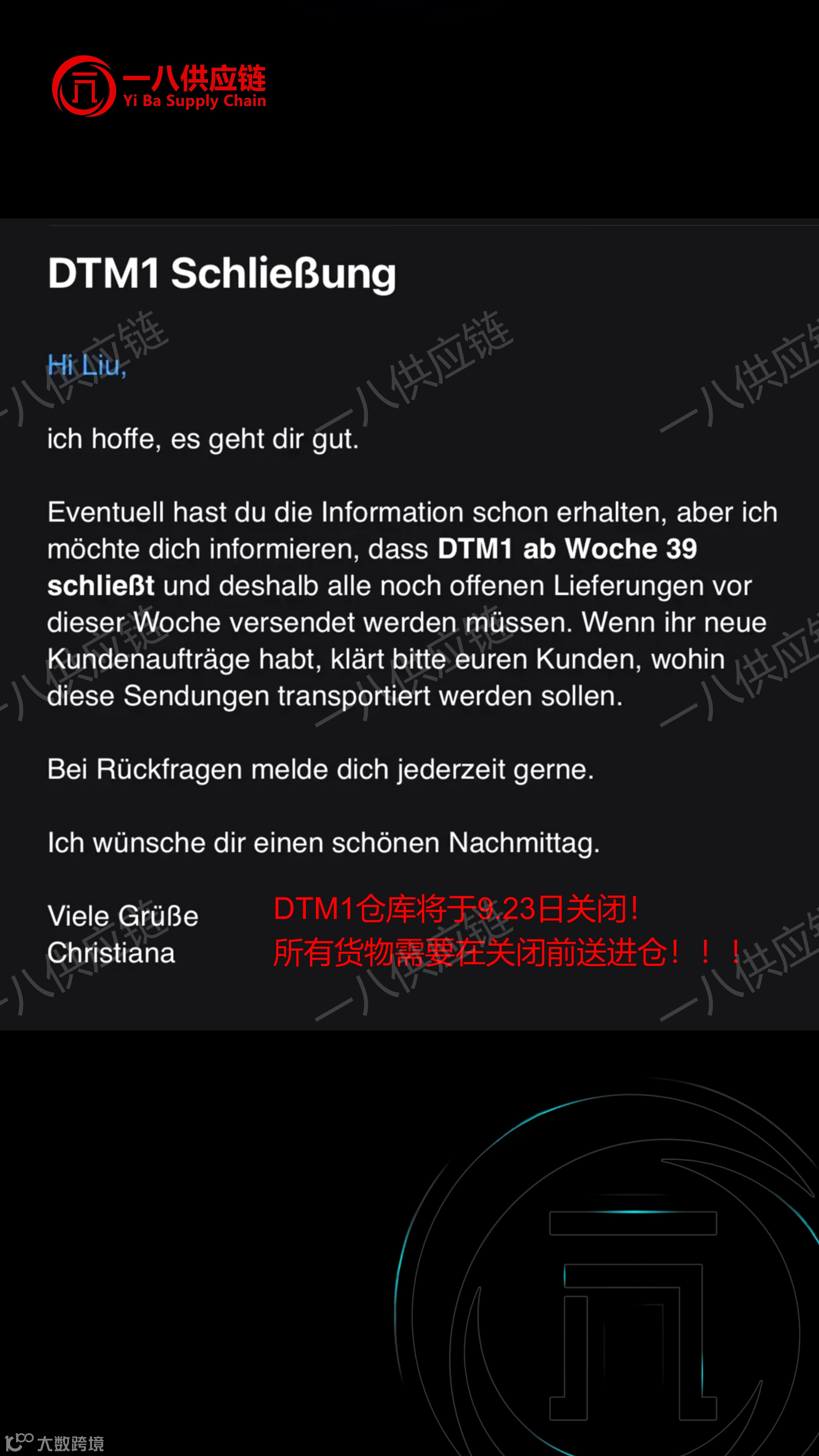 此外,德国的DTM1仓库也将在9月23日关闭,所有的货物需要在关闭前送进仓库。否则,在此时间后,该仓库将不再接收货物,货物将会被转至其他的亚马逊运营中心。