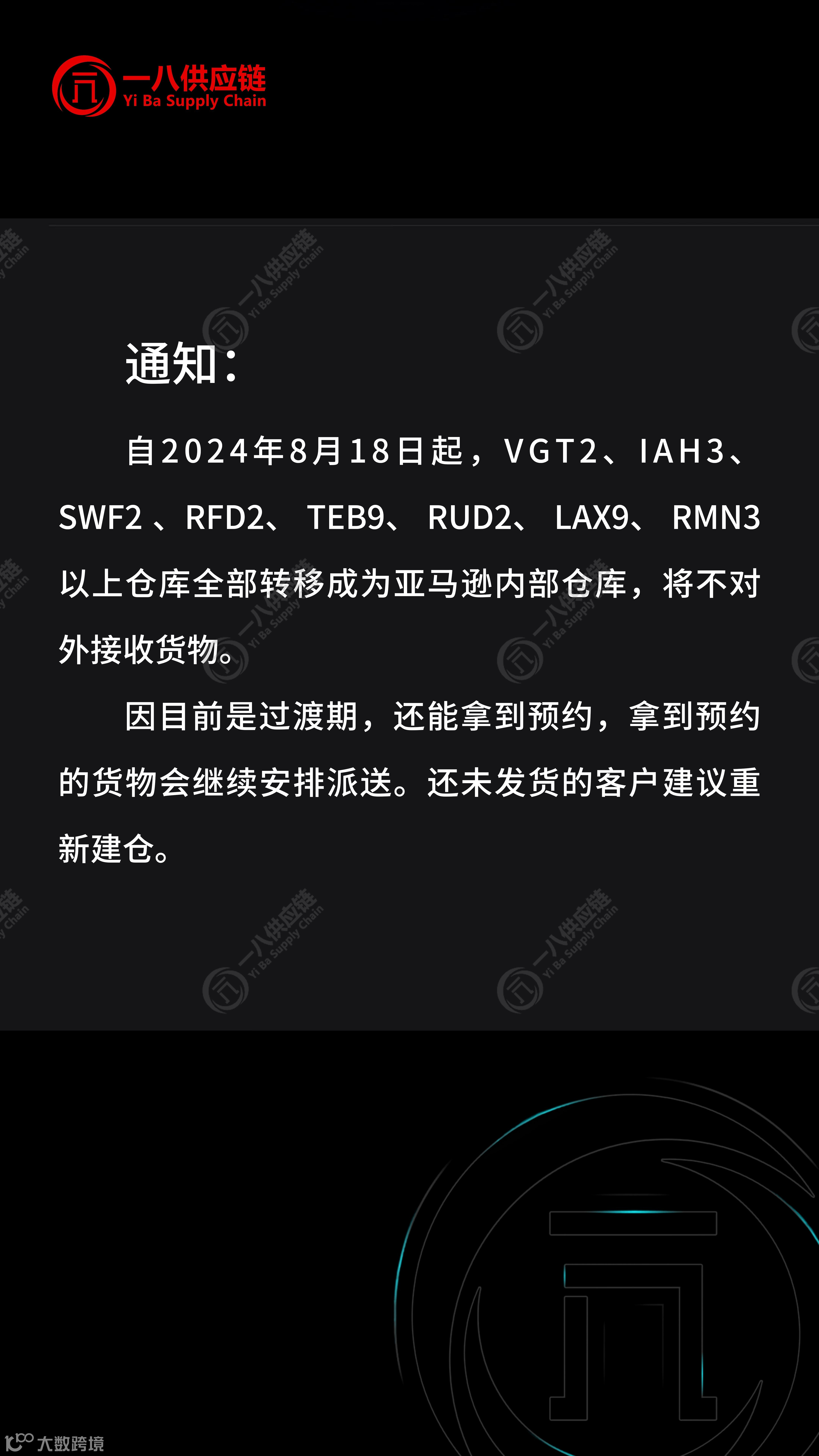 接亚马逊美国站点的有关通知,自2024年8月18日起,VGT2、IAH3、SWF2、RFD2、TEB9、RUD2、LAX9、RMN3以上仓库全部转移成为亚马逊内部仓库,将不对外接收货物。