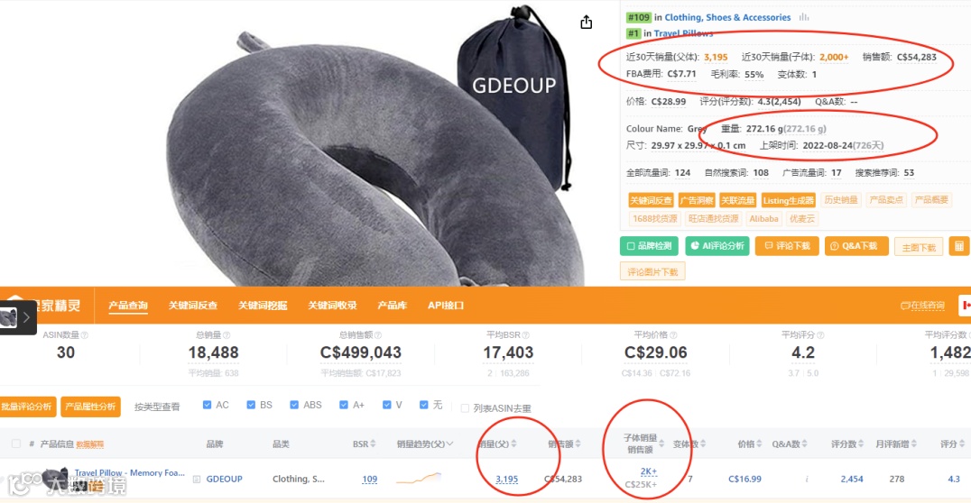 单量:在卖家精灵中显示上架时间是2022年08年24号,目前为止持续销售726天,30天销售量父体(3195),子体销量(2000+)