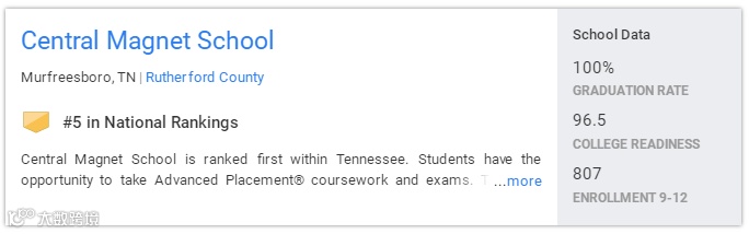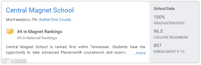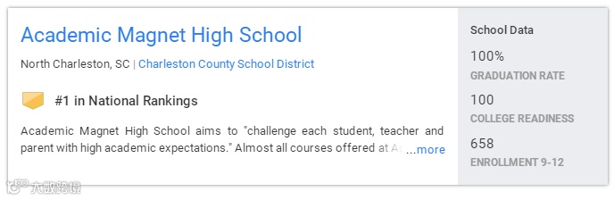在全美范围的高中独立排名中,南卡罗莱州Academic Magnet High School排名第一。这所磁力高中(不以学区为限的高质量专精公立高中)提供的几乎所有课程,都是荣誉学分或AP课程;每个学生在毕业前都需要完成一个独立的研究项目,部分学生论文甚至登上了专业期刊杂志。
