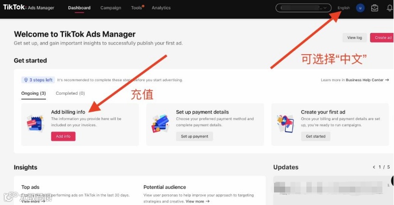 进入广告管理后台,点击"Add billing info"设置付款方式,预存费用后方可投放广告