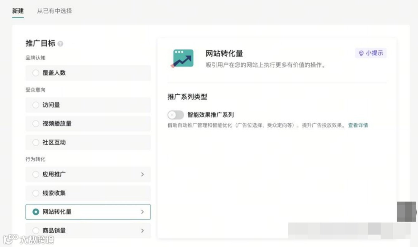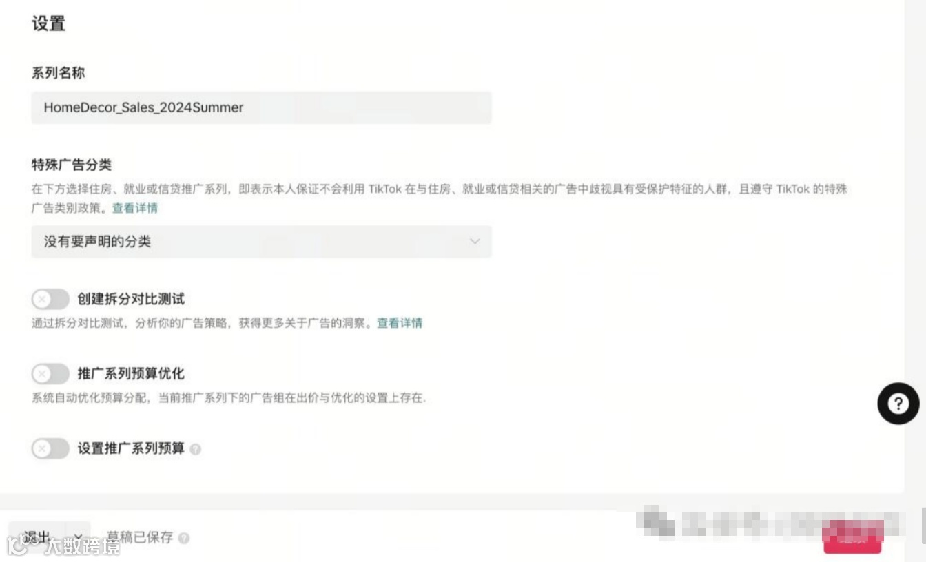 根据营销目标选择相应推广类型(以独立站转化为例),设置广告系列名称,建议关闭系列总预算,改为广告组单独预算控制