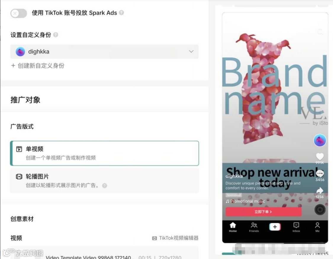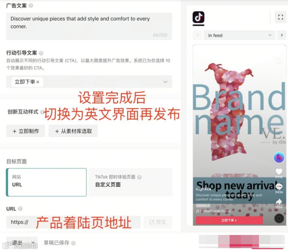 设置品牌头像与名称,选择广告样式并上传素材,填写广告文案与行动号召,最后切换至英文界面发布
