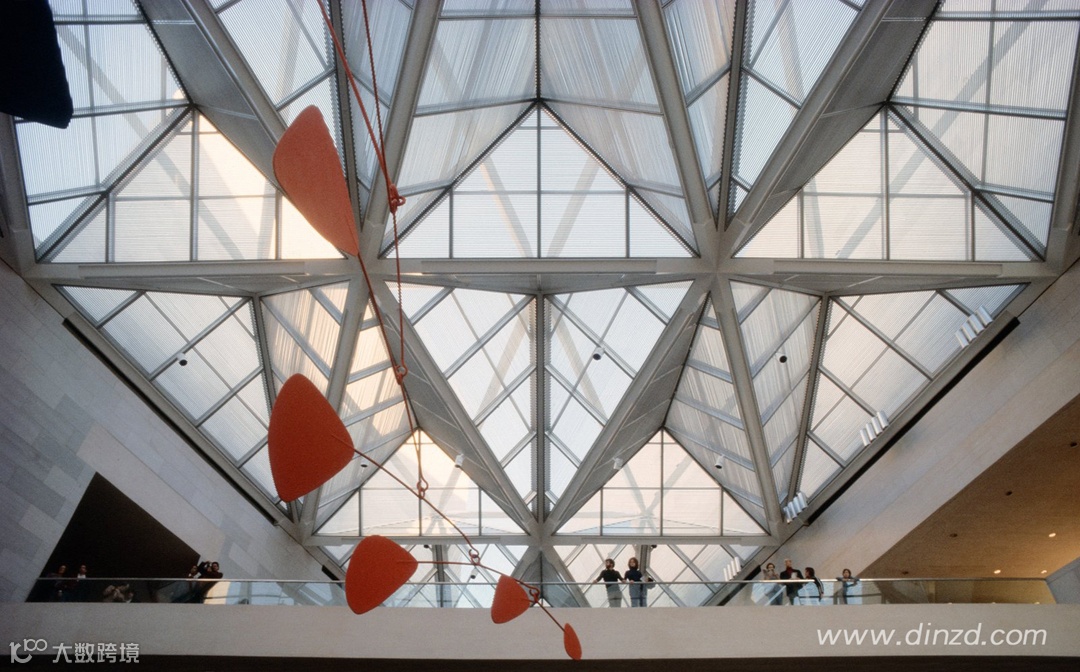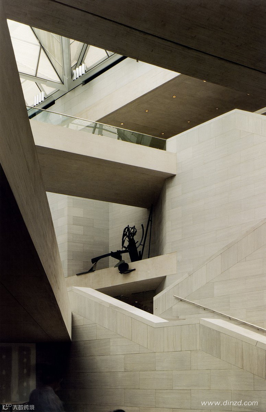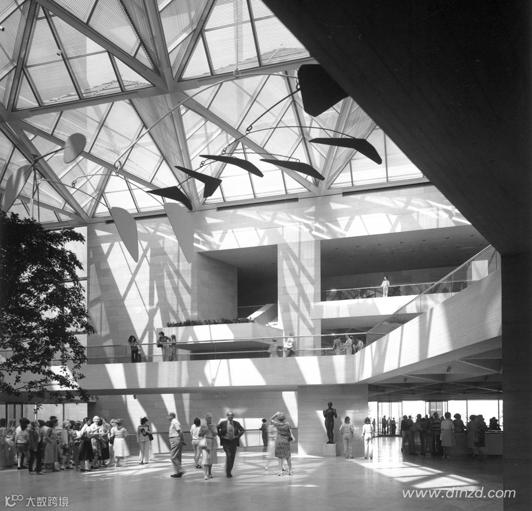 无论是从连接旧馆的地下通道,还是从第四街扁平的主入口进入,一进入中庭马上就会感到强烈的对比,不断变幻的角度、图案以及视角让整个空间都鲜活起来。中庭上方悬挂着缓慢转动的亚历山大·考尔德的动态雕塑作品,大厅里上上下下不同层面的跨桥、楼梯、嵌入壁龛的自动扶梯上都有参观者来往穿梭,迎合建筑特有的造型。设计小组的一位成员慨叹:“这一切都严丝合缝,简直可说是‘神来之笔’。”