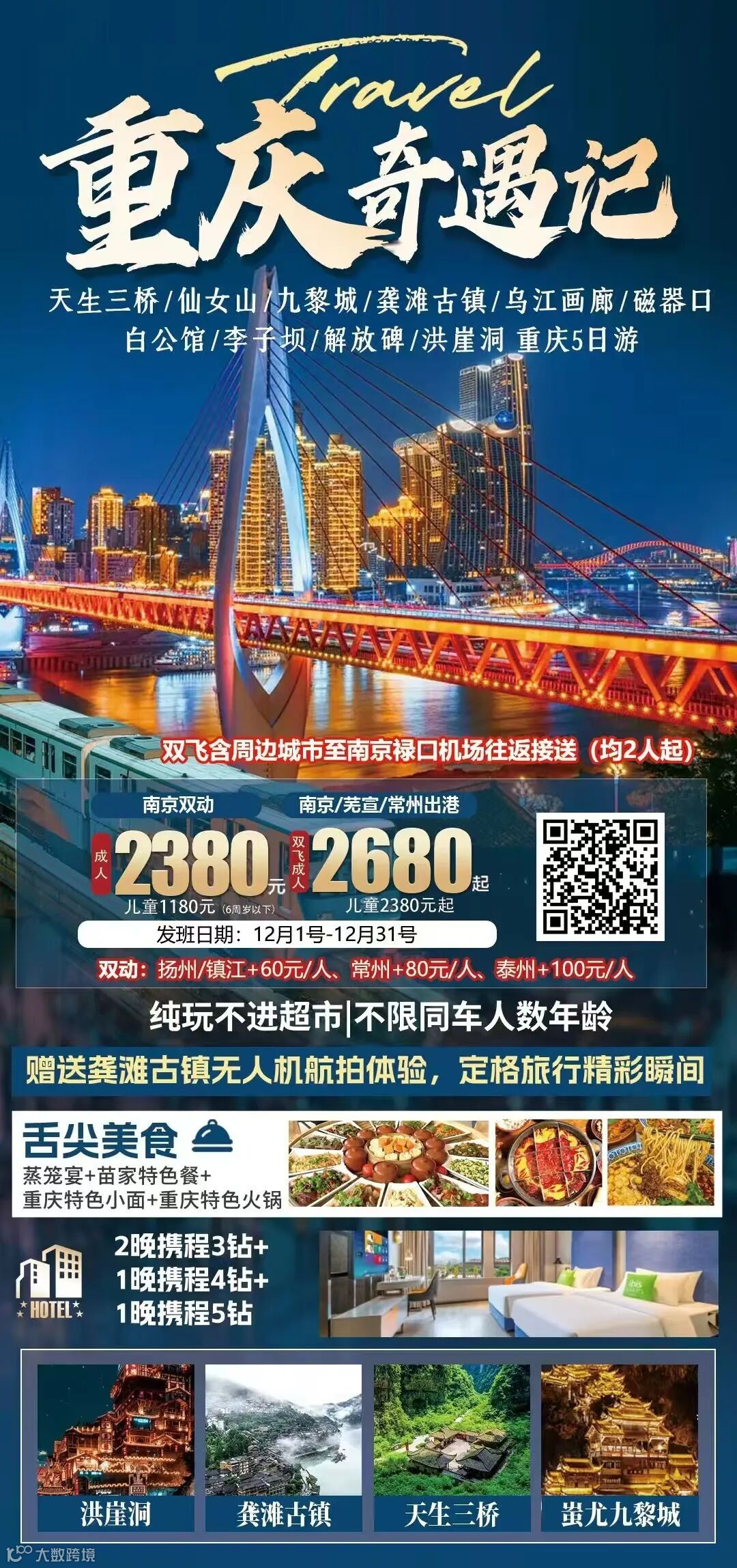 天生三桥-玻璃眺台-仙女山-九黎城-龚滩古镇-乌江画廊-磁器口-白公馆-李子坝-鹅岭二厂-魁星楼-解放碑-洪崖洞 重庆5日游