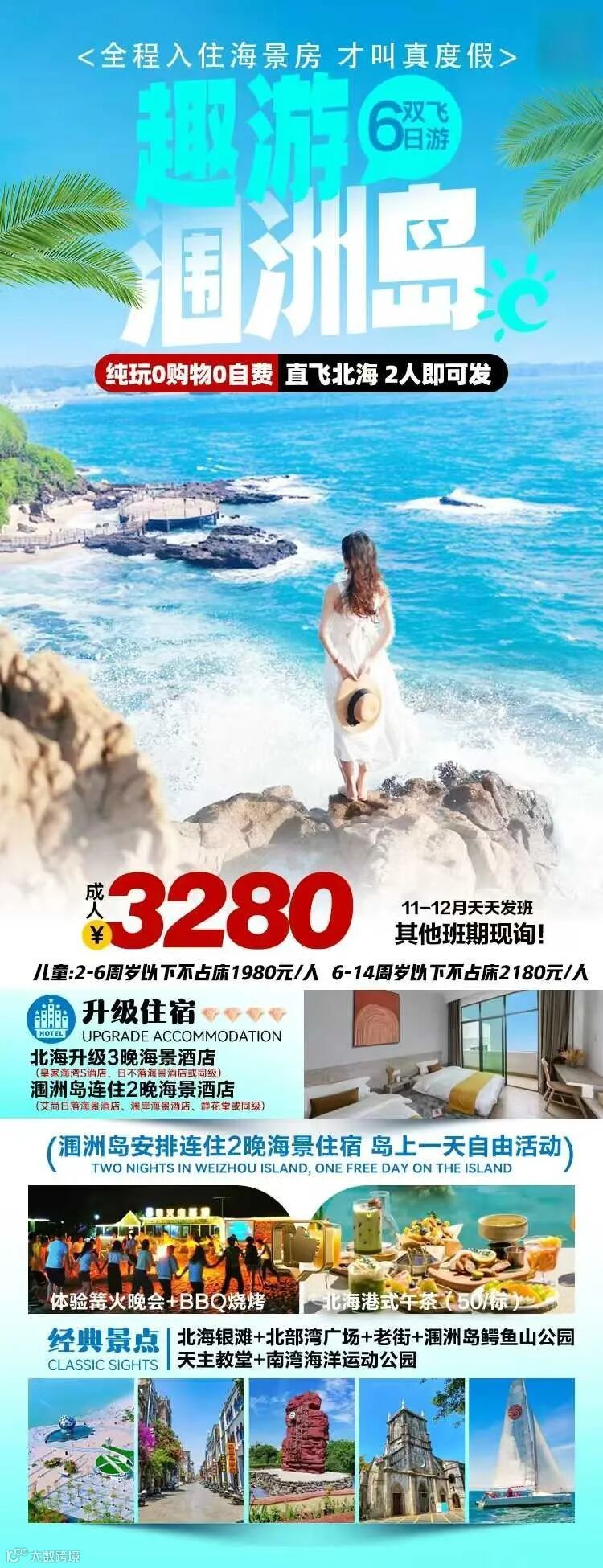 6、儿童价不含涠洲岛船票、上岛费。涠洲岛船票不能现补。超高小孩一定出团前提前补票。