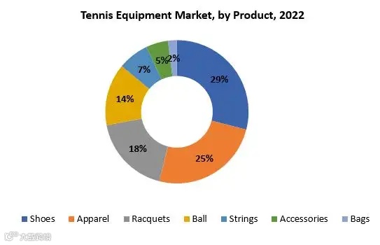 众所周知,网球是一项需要大量装备的运动。按产品可以分为鞋、服装、球拍、球、球线、包和配件。其中鞋类占据最大的市场份额,约29%。网球专用鞋对于提供有效操控腿部动作所需的舒适性、支撑性和稳定性至关重要。
