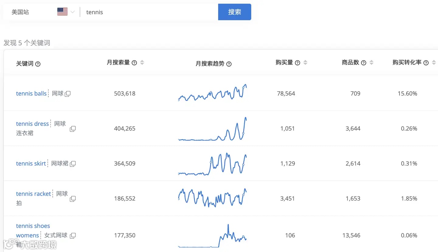 以亚马逊美国站为例,搜索tennis关键词,2024年7月相关词汇搜索量的排行情况如下:除了tennis balls之外(tennis balls这个关键词下不仅包含网球,还包含table tennis balls(乒乓球)、dog tennis ball(狗网球玩具),所以相对来说,后4个关键词关联的商品较为精准),tennis dress的月搜索量最高,其次是tennis skirt、tennis racket;其中dress的搜索量趋势曲线波动上涨最为明显。