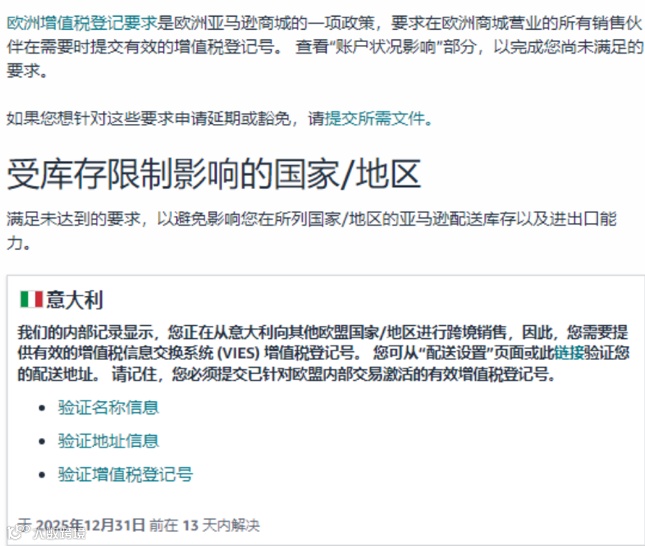 近期,亚马逊针对意大利VAT相关信息启动新一轮集中合规校验,不少卖家在后台陆续收到税号验证要求。