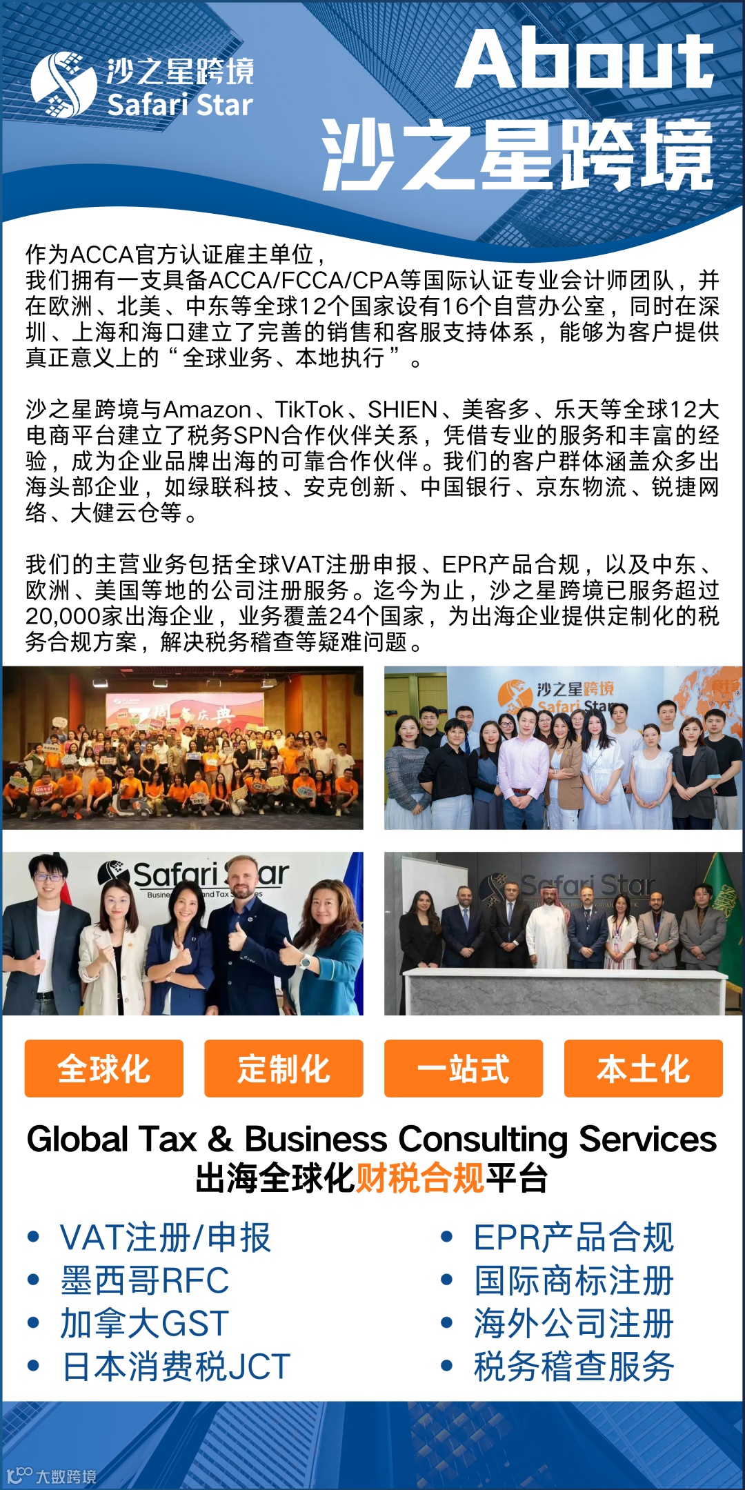 沙之星跨境深耕跨境财税合规行业10余年,始终以合规为核心,凭借英国母公司的全球视野与意大利本土公司的落地能力,为中国跨境卖家搭建安全的财税合规桥梁。