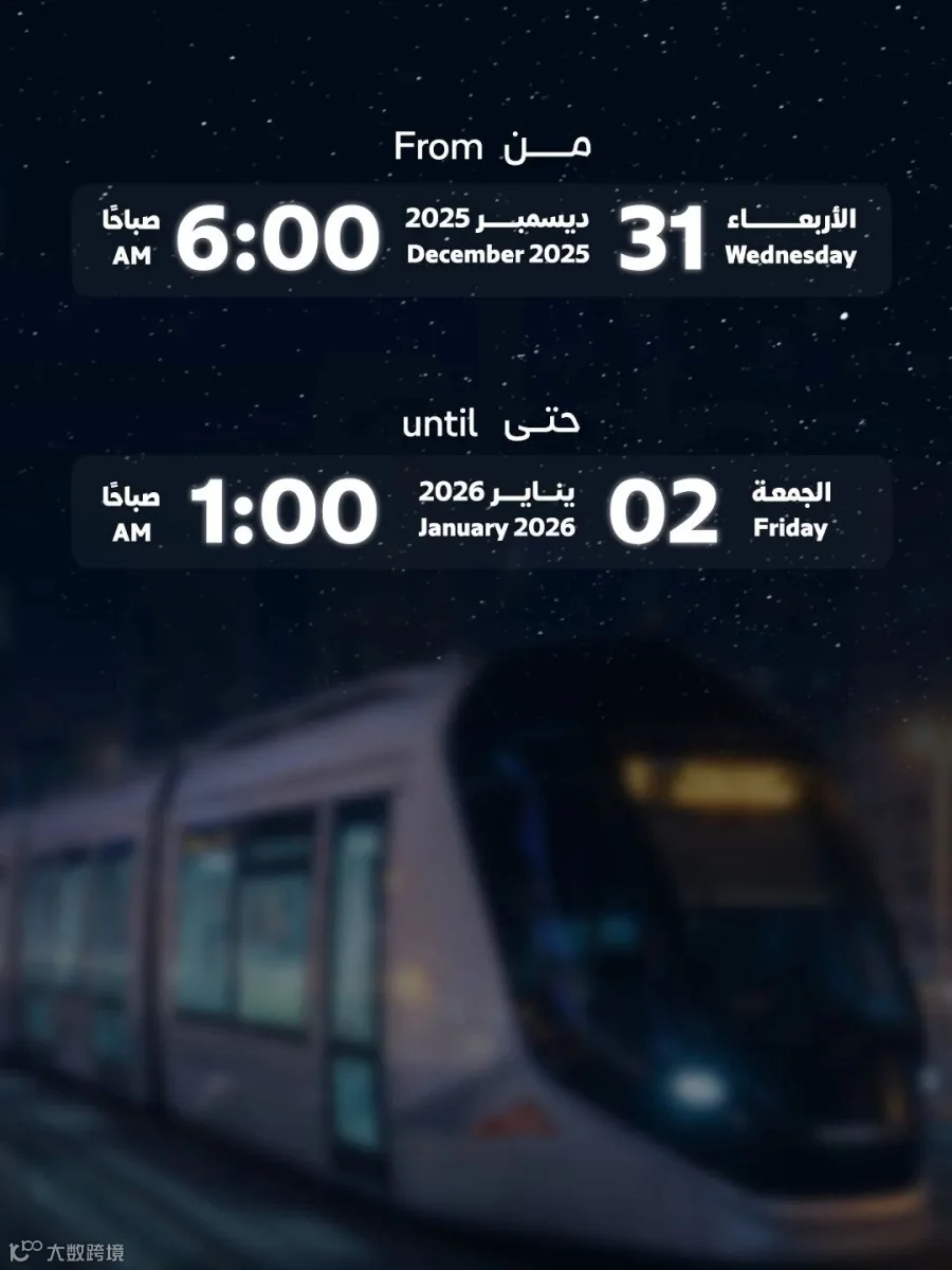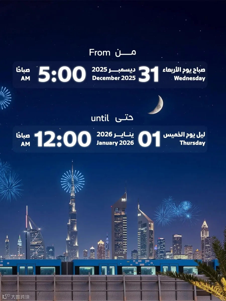 与此同时,迪拜轻轨服务将从12月31日(周三)早上 6:00 开始,一直持续到 1月2日(周五)凌晨 1:00