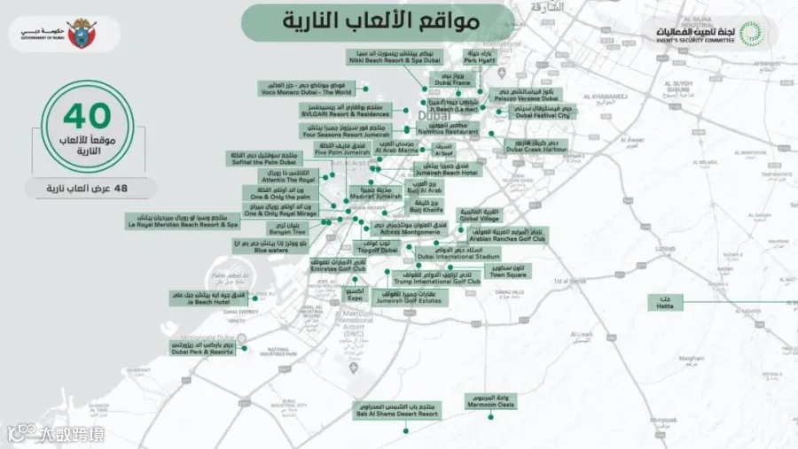 迪拜的跨年烟花秀(NYE 2026)将是全球最盛大的庆典之一。根据最新安排,迪拜将在全市40个地点 举行共计48场烟花表演