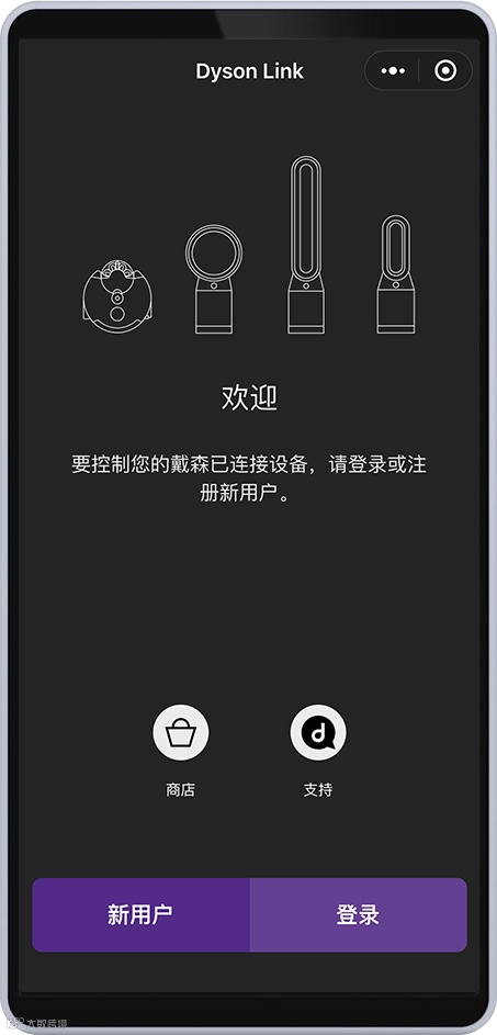 新用户注册流程简洁,已使用Dyson Link应用的用户可直接登录,同步已绑定设备,无缝切换操作平台。