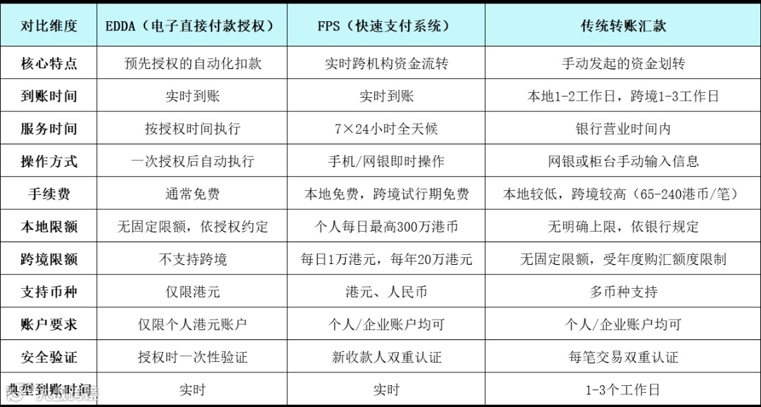 在香港进行资金流转,电子直接付款授权(EDDA)、快速支付系统(FPS)和传统转账汇款作为三种主要的银行转账方式,适用于不同场景,小编为您具体介绍