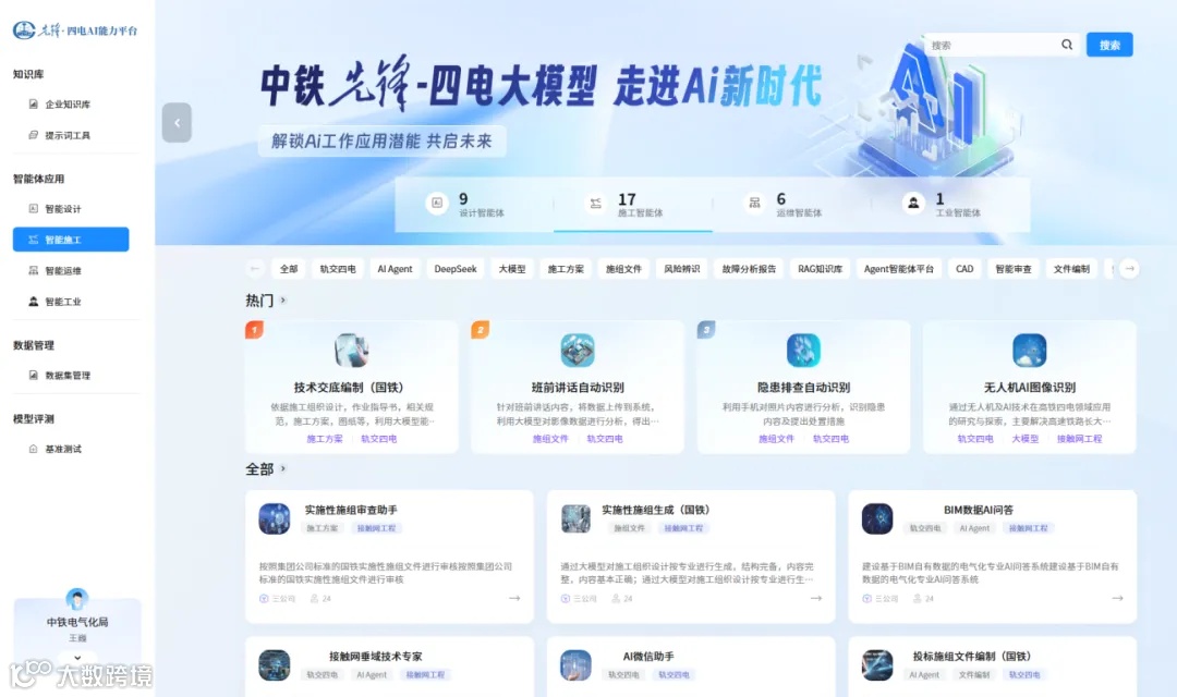 大模型围绕智能设计、智能施工、智能运维、智能工业四大核心业务板块,打造了“轨交四电”行业级知识共享平台,构建起工艺设计、施工管控、装备运维等全要素联动的“轨交四电+人工智能”新范式。