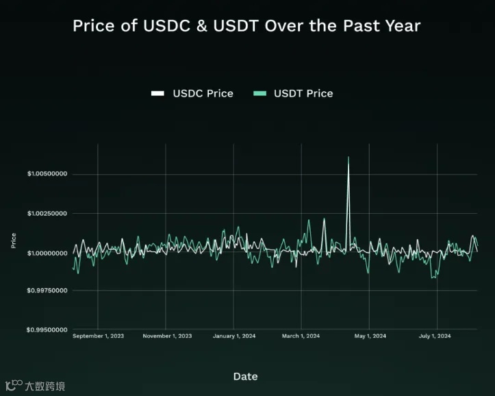 比较USDC和USDT过去一年价格的图表显示,这两种稳定币具有显著的稳定性。尽管图表的放大特性放大了小幅波动,USDC与美元的挂钩非常紧密。在观察期间,USDC的价格几乎没有超过目标1.00美元的5-10个基点(0.05%-0.10%)的偏离。