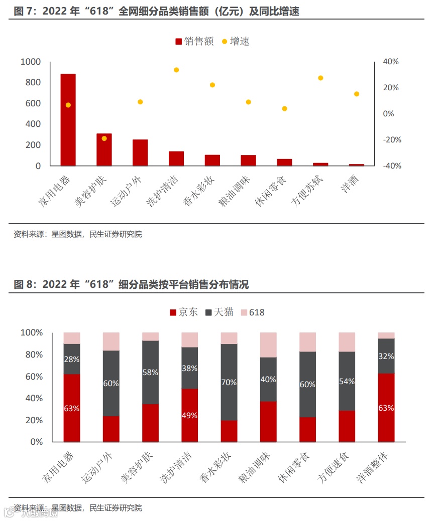 此外,运动户外和洗护清洁类目销额为249/136亿元,同比各增9.1%/33.1%。