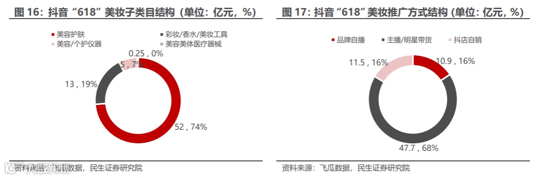 抖音美妆大盘:6月1日-6月18日,抖音美妆品类实现预估销售额70亿元,相比2021年整个6月的美妆销售额46亿元,增长了52%。其中美容护肤、彩妆香水、美容个护仪器、美容美体医疗器械分别实现销售额52/13/5/0.24亿元。按推广方式来看,品牌自播号实现销售额11亿元,占比16%。
